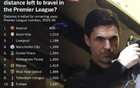 • TA列英超各队剩余客场行程距离:阿森纳最少,曼城为其两倍